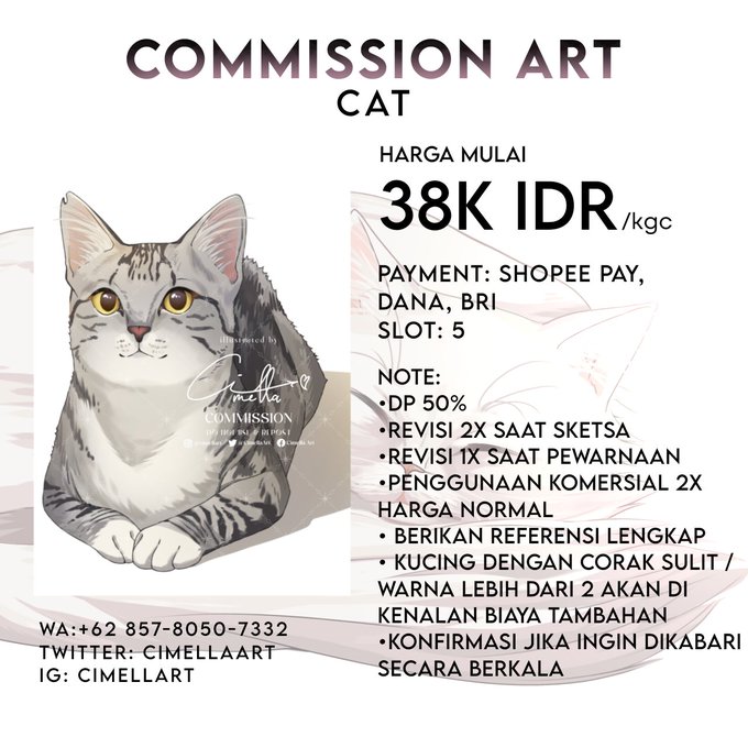 [OPEN COMMISSION] halo semua~ Aku Ella Tan, aku buka lagi Commission tapi khusus KUCINGGG LAGI!!✨ Boleh banget buat tanya tanya!! DM atau chat wa ku yg di bio yaa~ (◍•ᴗ•◍)❤ @CmsnArtist_Id #zonakaryaid #commissionsopen #Commission #ArtistOnTwitter