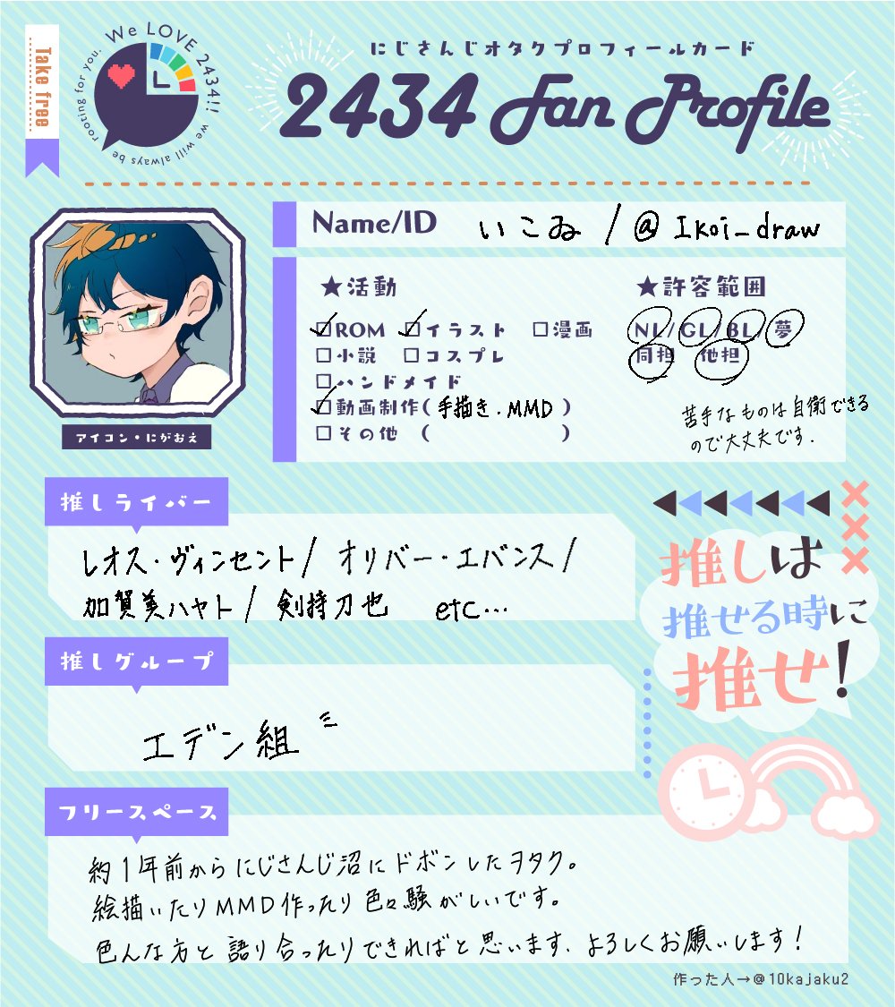 にじそ前にタグ失礼します🙇♂️ 楽園組や🖤💻💙中心に箱推ししてます 最近は🔺やENがとても好き RT中心にお話し会うなと思った方お迎え行きます❤️🔥 #にじさんじ好きな人と繋がりたい #にじさんじレイヤーさんと繋がりたい #にじさんじ絵描きさんと繋がりたい