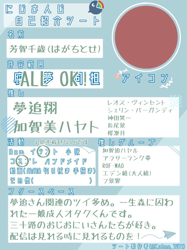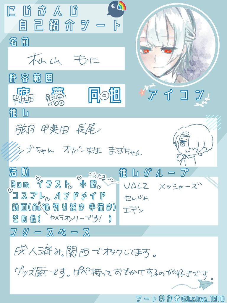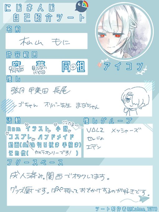 #にじさんじ好きさんと繋がりたい #にじさんじ絵描きさんと繋がりたい #にじさんじレイヤーさんと繋がりたい にじさんじ沼にズブズブの成人済み関西在住オタクです〜!! お絵描きとカメラが趣味!!!グッズとボイス購入は呼吸!!!!! 気になった方ふぁぼりつどちらも巡回します〜🤗