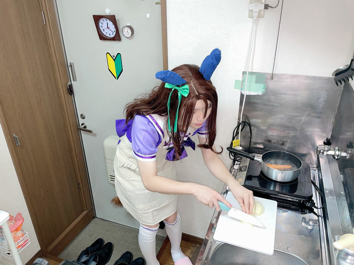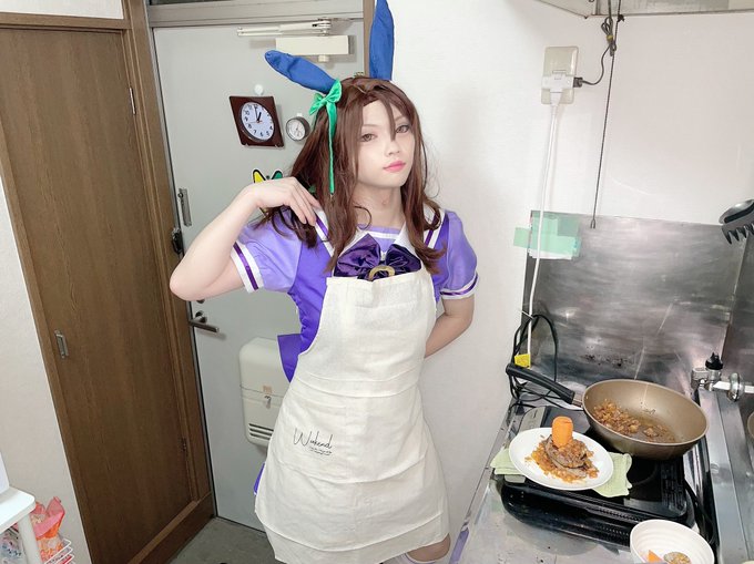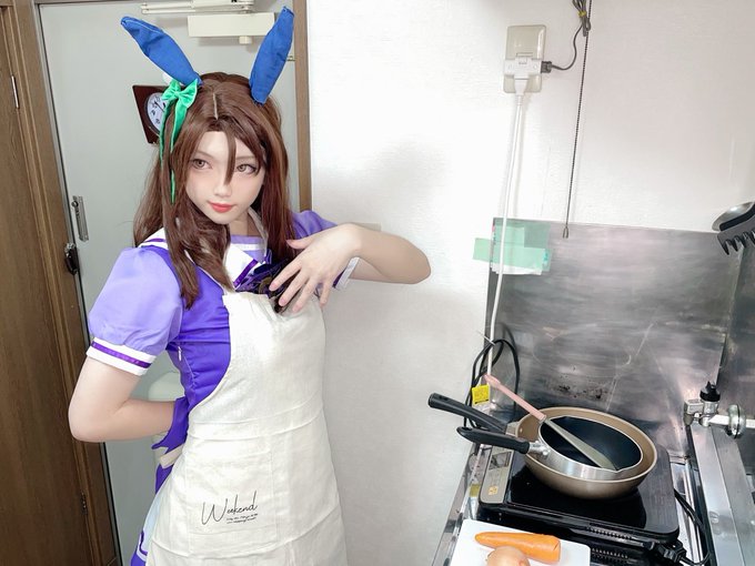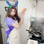 【 #cosplay 】 「タマネギのみじん切りだって……あ痛ー!?」 「うう……目が……へっぽこぉ……」 「こ、こうすれば……油が跳ねても熱くな熱っ!?」 #クッキングヘイロー #ウマ娘になってしまいました