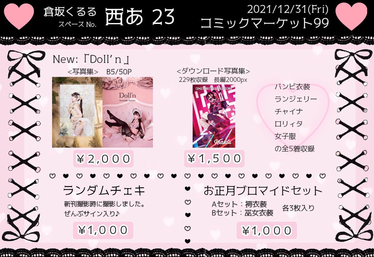 🖤💗#C99 お品書き💗🖤 2021年12月31日(土) #コミックマーケット99 2日目 西あ23b くるーじゅ 皆様のお越しをお待ちしております🐾 通販は1/1以降発送していきます📮 kurasakakururu.booth.pm