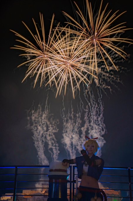 #コンパスエンジョイ部 ①深川まとい ②衣装手作りで腰綱は拘りたくて本物の綱で作り、火筒は自分の身長に合わせる為にミリ単位で組み上げ作業しました 写真はまといちゃんで花火撮影したくて4年前の花火が上がるイベントで撮影してもらいました