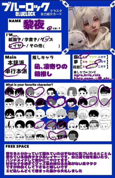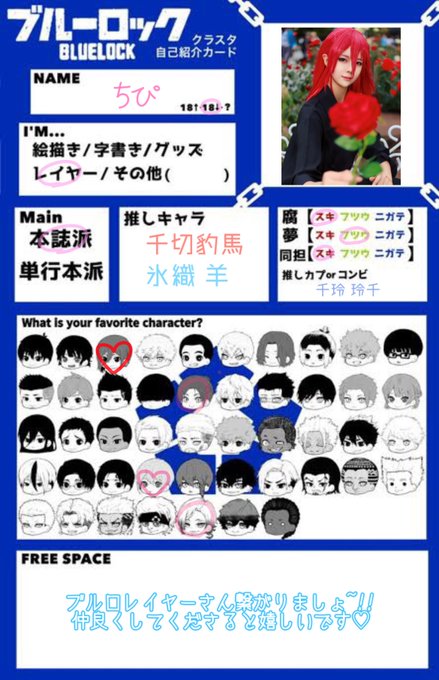 ブルロ界隈のお友達少ないのでど新規ですが仲良くして頂けたらうれしいです🥲💓 おたく兼レイヤーです🐈⬛🎀 ♡、RT中心にまわります! #ブルロ好きさんと繋がりたい #ブルロクラスタカード #ブルロレイヤーさんと繋がりたい #ブルーロック絵描きさんと繋がりたい #ブルーロック好きと繋がりたい