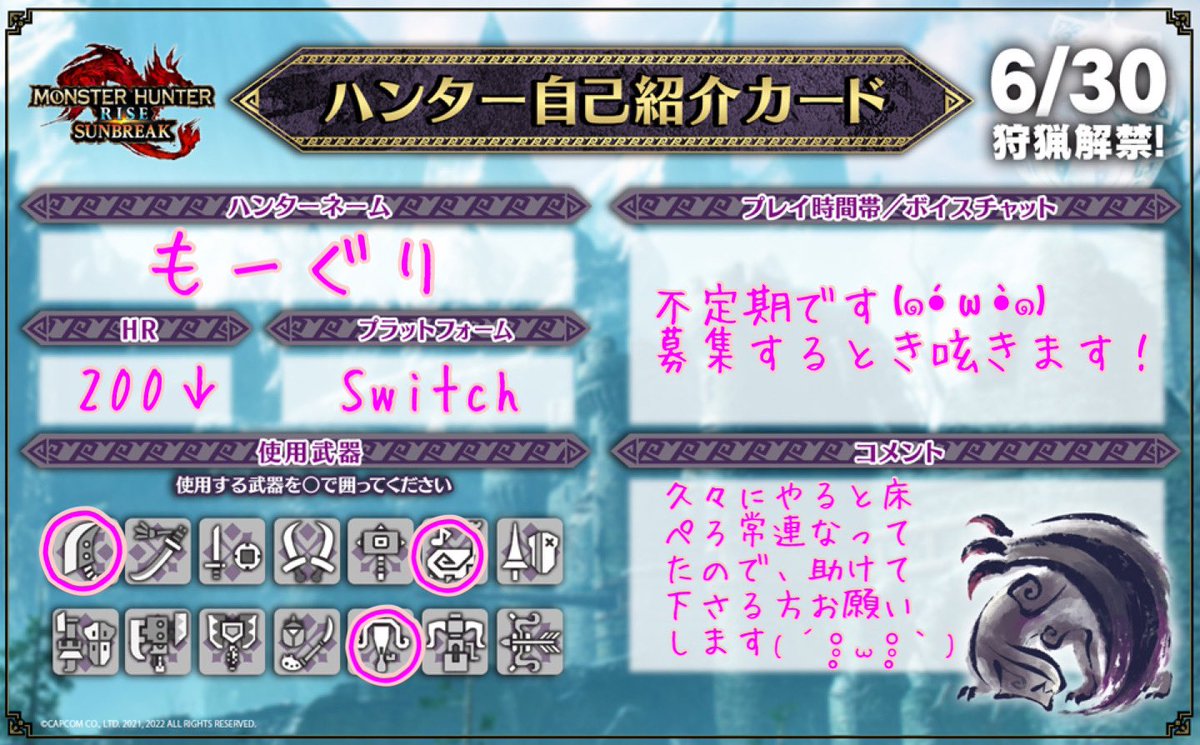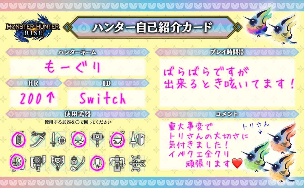 モンハンの季節が来た(#゚ロ゚#) 自己紹介カードつくりました💕 ⚠︎コスプレする雑多垢なので苦手な方ご注意ください(><) #モンハンライズ自己紹介カード #モンハンサンブレイク #モンハン女子
