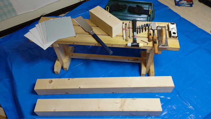 さてと、作るか。 今日でどこまで進むかわからないが (画像に写っているスナイパーライフルとショットガンを木彫りで製作) #コスプレ #木彫り