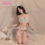 💙独特な淡いピンクと淡い緑のデザインが特徴で、かわいいうさ耳ヘッドバンド、レースのネックレスとブレスレット、エキゾチックな流れる紐付きのビキニ風ブラジャーが揃います。 🔗moenonori.shop/items/641a9679… #月のうさぎさん #浴衣 #ランジェリーセット #コスプレ #撮影 #ランジェリー #cosplay