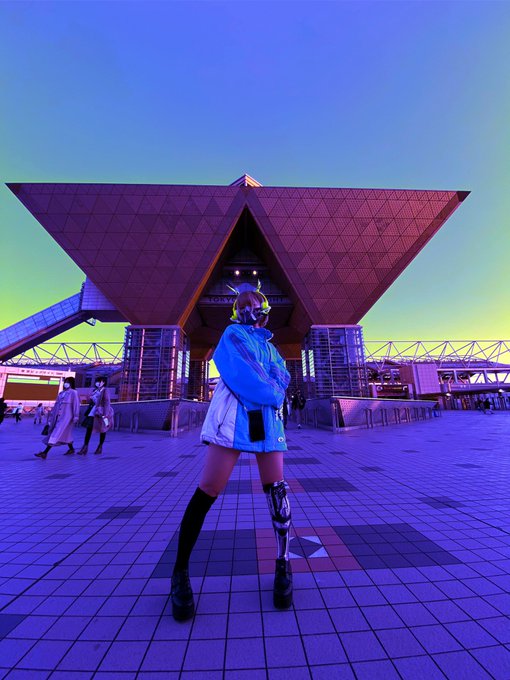 未だにデザフェスでの余韻が残ってる..!! 夕焼けが綺麗な時にビッグサイトをバックに撮るとめっちゃエモくなるよね..💙 #デザフェス #東京ビッグサイト #サイバーパンク #サイボーグ #中央町戦術工芸 #雰囲気推してください #いいねで気になった人お迎え #コスプレイヤーさんと繋がりたい