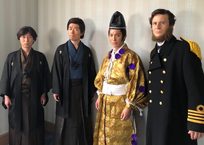 2 11 ◯◯年連続で今年もクリぼっち確定なので、リア充っぽい写真でごまかしておきますね(震え声 左から井上馨、伊藤博文、高杉晋作、クーパー提督です🤗 #青天を衝け 的な #大河ドラマ 風に #オフショット 撮影 #コスプレ じゃなく衣装です 21/12/23 23:03
