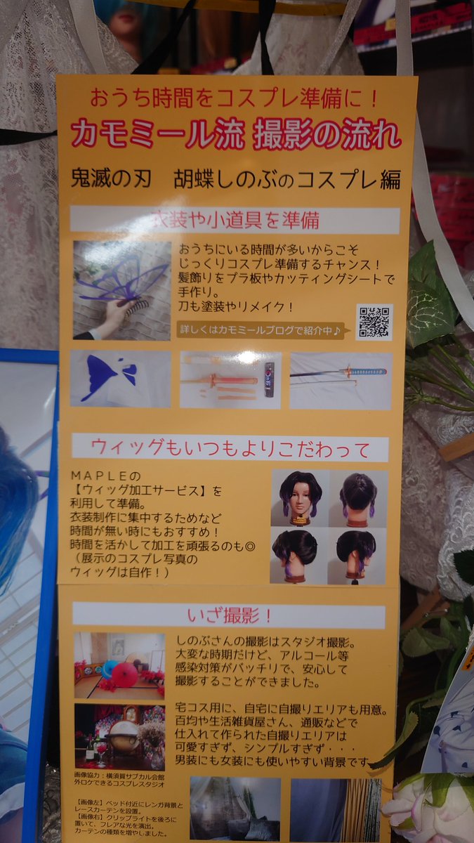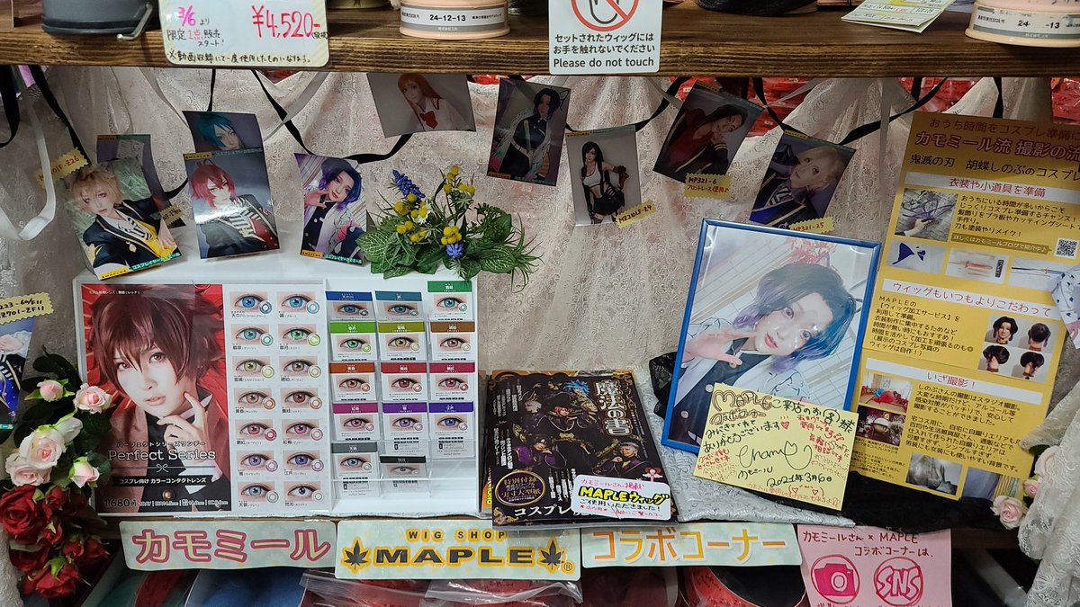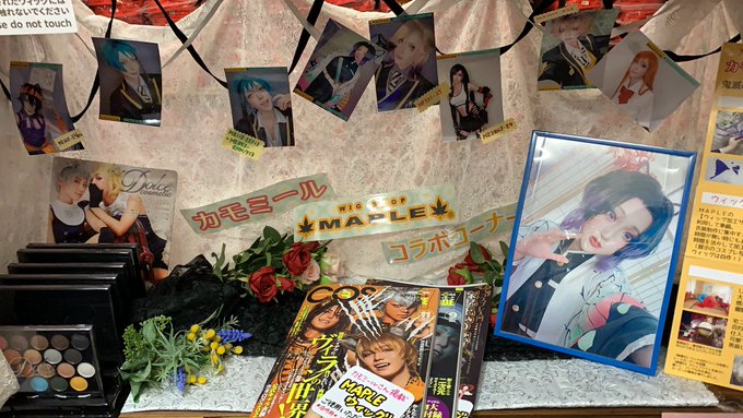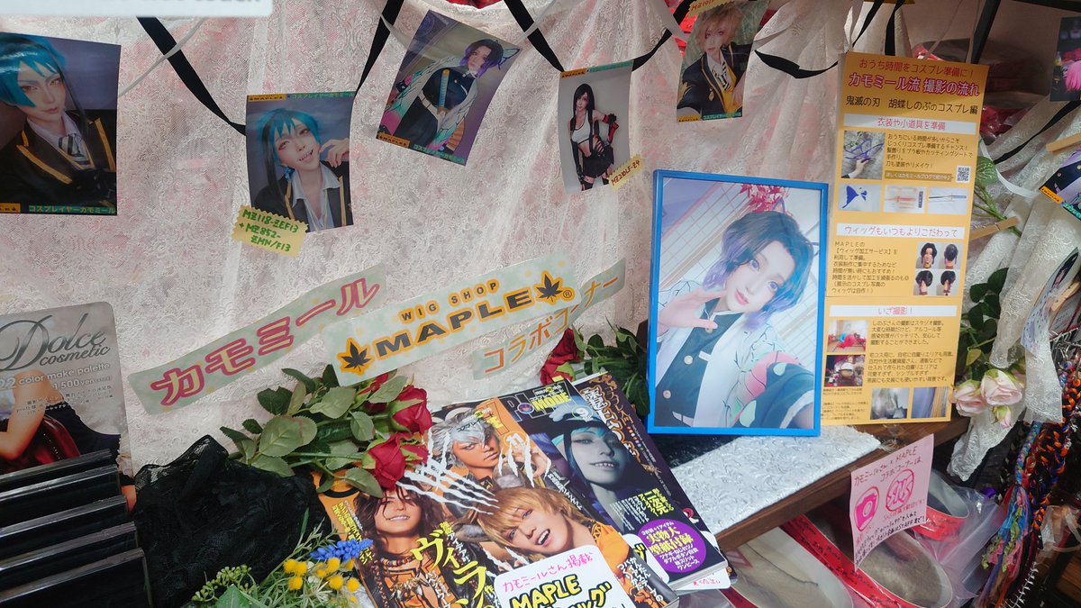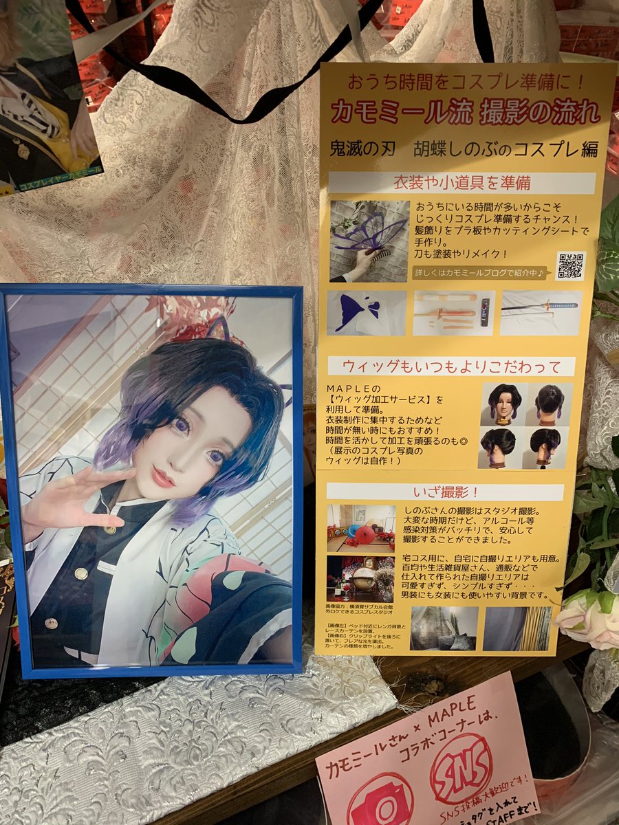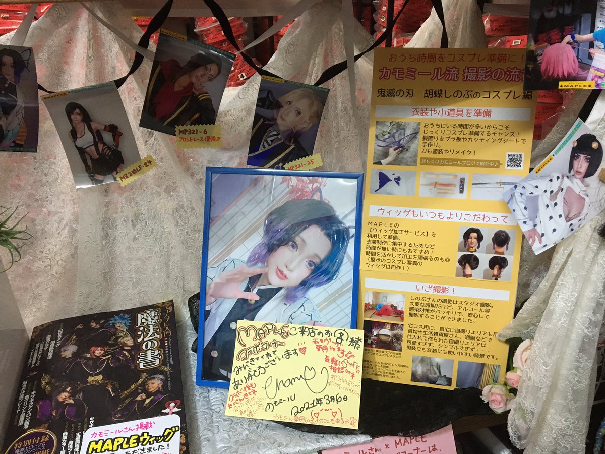 2度目のMAPLE池袋店😆 いつ見ても素敵なコーナー‼️ 写真や造花などの色合いが綺麗☺️ 小道具やウィッグ加工サービス、DIYについて書かれたポップもあります✨ #コスプレイヤーカモミール #MAPLEウィッグ