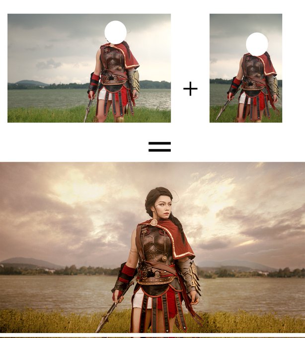 daily life of a retoucher⭐ before & after →combine the background of p1 with the posture of p2 → grass in the original picture is too jumpy, so I changed it to yellow, which looks not abrupt. →Added some scars #AssassinsCreed #AssassinsCreedOdyssey #cosplay #Photoshop