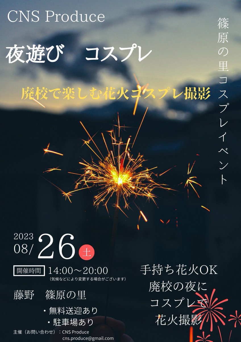 さて、今週末 8/26(土)は #CNSコス は #夜遊びコス 🎆 篠原の里🏫! イベントをすでにお申し込みの方でまだJR藤野駅からの無料送迎の予約をされていない方は、お早めにご連絡ください🚗(※各時間、定員に限りが御座います。) まだこれからの方はこちらよりどうぞ。 ⏩cns-produce.com/event-details/…