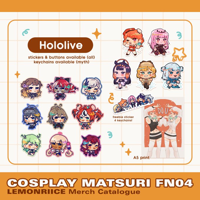 My merch catalogue for #CosplayMatsuri2022 !! 💛🍋 premiering my new hololive + nijisanji stuff!! last stocks for old stuff i'm phasing out too ! :')) Catch me at the #CosmatsuriFanfair2022 area at table FN-04 at SMX, Dec 28-30 ! See you there!! 💪