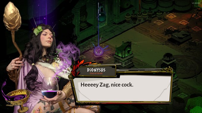 "That sound...That was...revelry? People having a good time? Well, sure, then! In the name of Hades! Olympus, I'll accept this message." 🥻: @RainbowRex 📸: @Maison_Hikari 🍷: @princeofdrunk 🎮: @SupergiantGames #dionysuscosplay #hadescosplay #cosplay #Hades #dionysus