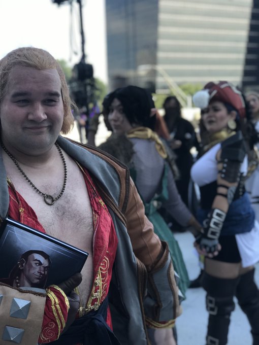 Chest Hair? Chest Hair ❤️👄❤️ Varric: @Dctua_Seto Merrill: @eletania_ Bela: @SirensCallCo #dragonage #cosplay