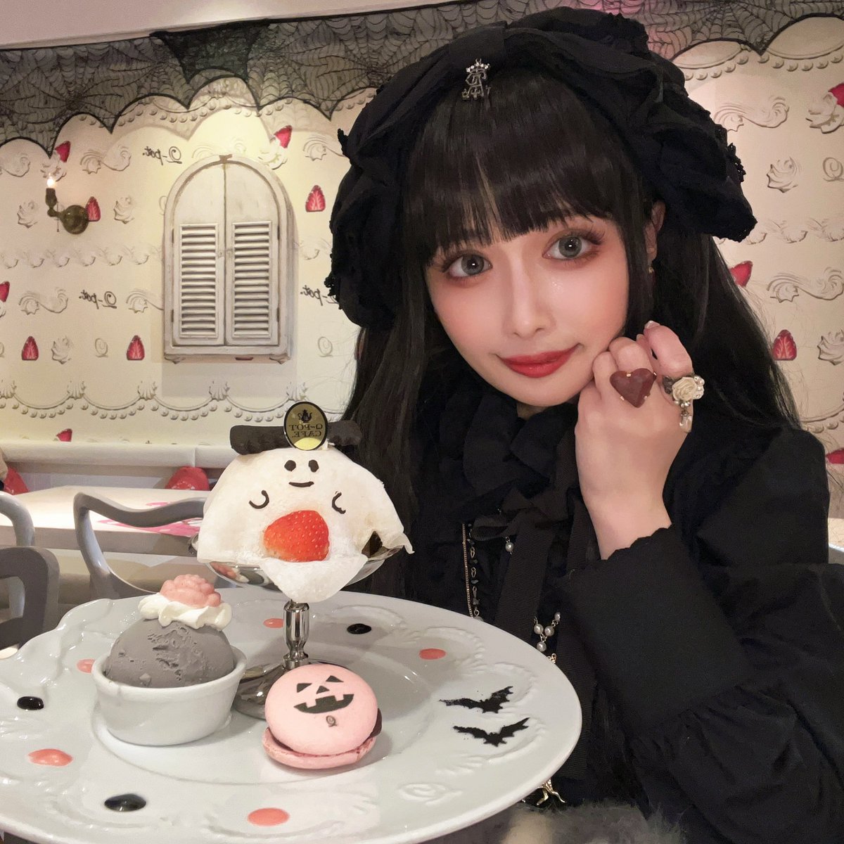 ラパラビさんでご一緒させて頂いた皆様と #ゴスロリマーケット さんにお邪魔させていただいて、 皆様でQ-pot CAFE.さんでお茶会をしました♥ おばけちゃんプレート👻かわいい♥ 今回はドレスコードが黒だったので 真っ黒まゆろんだよ♥ #GLM7