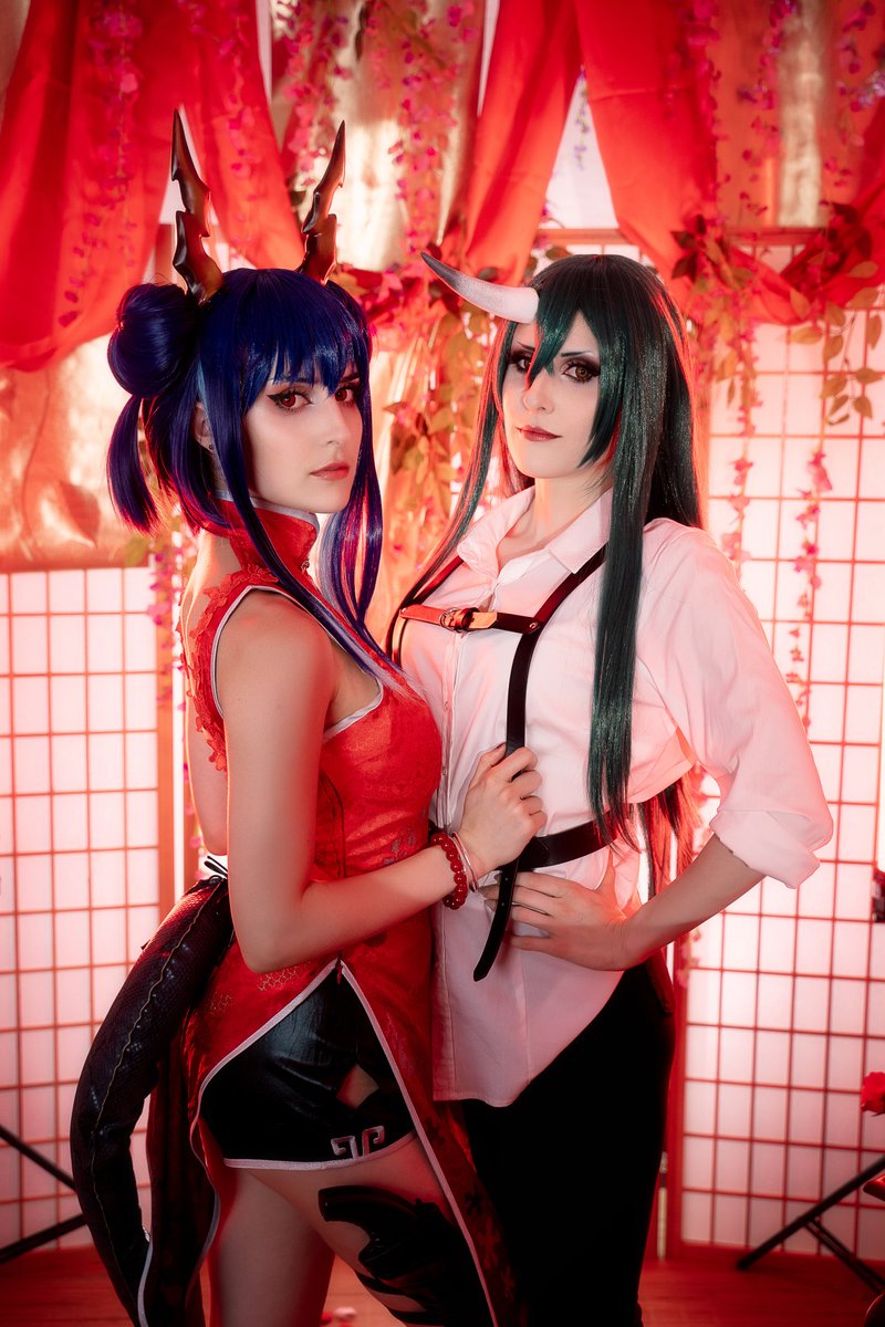 You can find more Hoshiguma x Chen content in our latest photoshoot at 👉 shoptly.com/i/b8ga Still one spot available for a 10% discount with code "GLOW" 🔥 Ph by @dizzymonogatari #hoshiguma #chen #明日方舟 #arknights #cosplay #アークナイツ #コスプレ #コスプレ