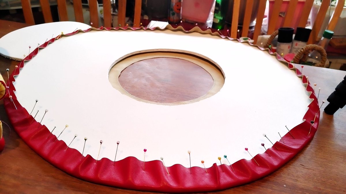 Current progress on the hat: brim and body sewn together. Going to add the trim underneath tonight maybe that I want (not in my coming tutorial) #HazbinHotelValentino #HazbinHotel #cosplay #wip #sewing