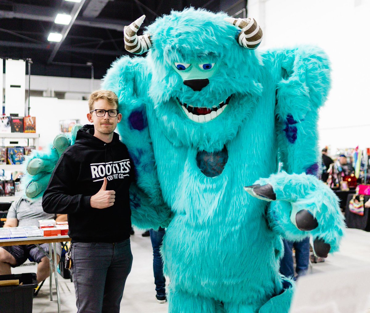 ✨ You / You before coffee 👹 Don’t be a monster. Drink better coffee. rootlesscoffee.com 📸 @hcatherinephoto #monstersinc #sulley #cosplay #comiccon