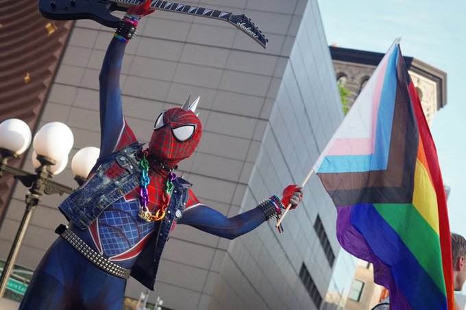 We raise our flags to represent who we are. We must stand up defend our rights. #cosplay #spiderpunk #SpiderMan #spiderpunkcosplay #SpiderMancosplay #marvel #pridemonth #Pride2022 #NYCPride2022 #NYCPride #PrideParade #prideparade2022 #LGBTQ #Action4Justice #Activism #iamgay