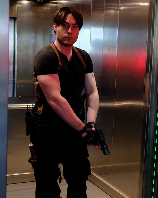 Pictured: Leon Kennedy emerging from the elevator, gun drawn, ready for trouble. Not pictured: The NEC security guard aggressively side-eyeing me for holding up the elevator and getting ready to be that trouble. Photography by Cosplayflame. #RE4remake #cosplay #LeonKennedy