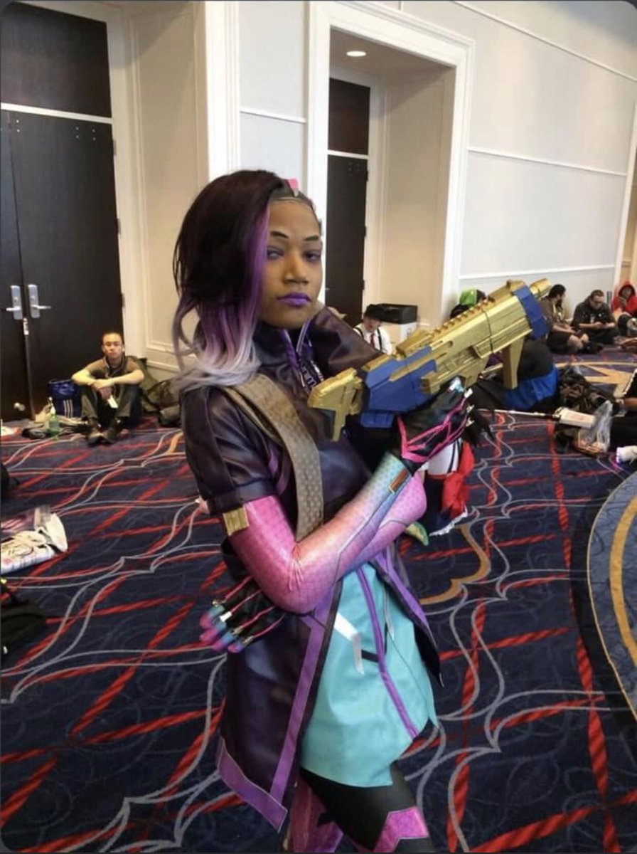 Did you know I once cosplayed Sombra from #overwatch ? I got to borrow @Sakuraflor_ 's cosplay for a gig and I felt so badass😍💜 Y'all know now I love purple, so this cosplay was amazing haha! #overwatchcosplay #sombra #boop #purple #badass #gaming