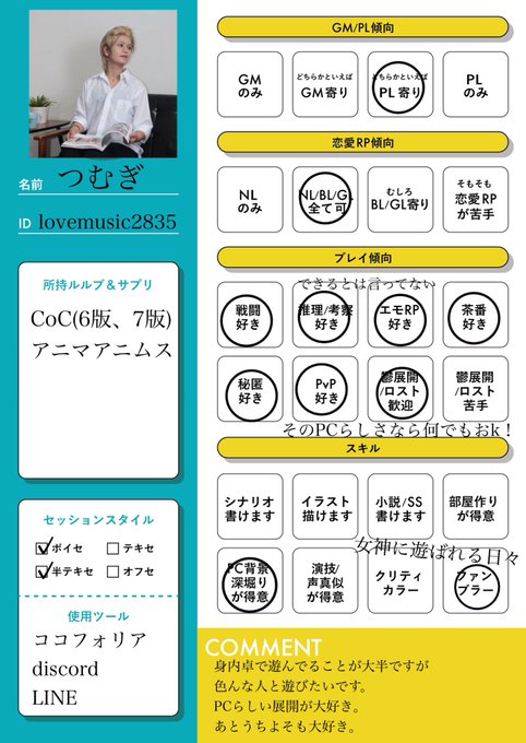 ( 'ω'o[コスプレイヤーです。コス写真も上げるアカウントなので注意してください]o 新年なのでさくっと更新!身内卓で遊んでることが多いのですが、沢山の人と楽しい卓を囲めたらなぁって思います! PCどの子も思い入れ深いから誰選ぶか悩むのよ。 #TRPG自己紹介シート #TRPG好きと繋がりたい