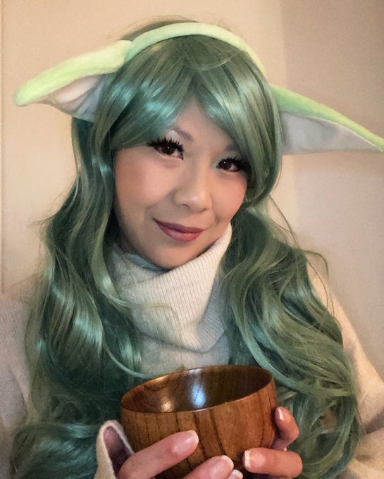 What’s for lunch? #alwayshungry 💚🍵🐸 #grogu #babyyoda #themandalorian #thebookofbobafett #babyyodacosplay