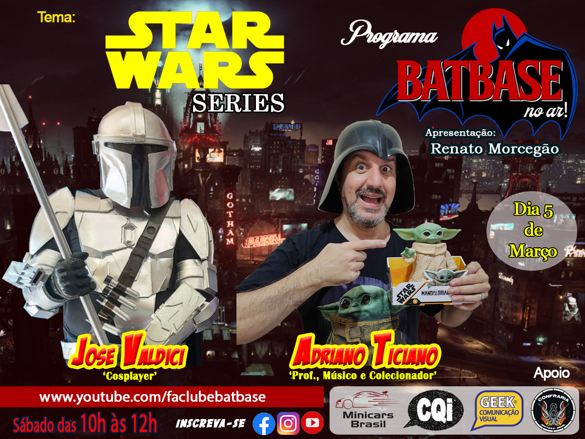 Não perca, neste sábado à partir das 10h, pelo YouTube da Batbase! youtube.com/faclubebatbase #cosplay #batbase #starwars #starwarsseries #themandalorian #TheBookOfBobaFett #kenobi #roguesquadron #batbasenoar