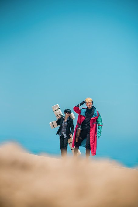 (cosplay) a few more phone snaps from the our 2 day shoot! the wind was somethibg fierce :') 📷 @crow_zoey #TRIGUNSTAMPEDE #TRIGUNcosplay #vashthestampede