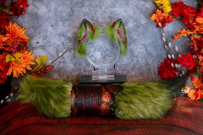 🧟♂️🩸ℨ𝔬𝔪𝔟𝔦𝔢 𝔚𝔬𝔩𝔣 𝔖𝔢𝔱🩸🧟♂️ • OOAK & handmade with love! Looking for a furever home at FoxxyFurends.com 🧟♂️💚🩸! • ⬇️More pics and deets bellow⬇️ • • #animalears #handmade #ears #cosplayears #cosplay #furry