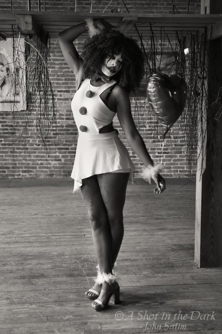 #PennyBBain is #Pennywise and hopes you won't be pound foolish . . #cosplay #It #StephenKing #clown #evil #balloon #heart #womanofcolor #redhead #curlyhair #tattoos #legs #heels #sandals #picoftheday