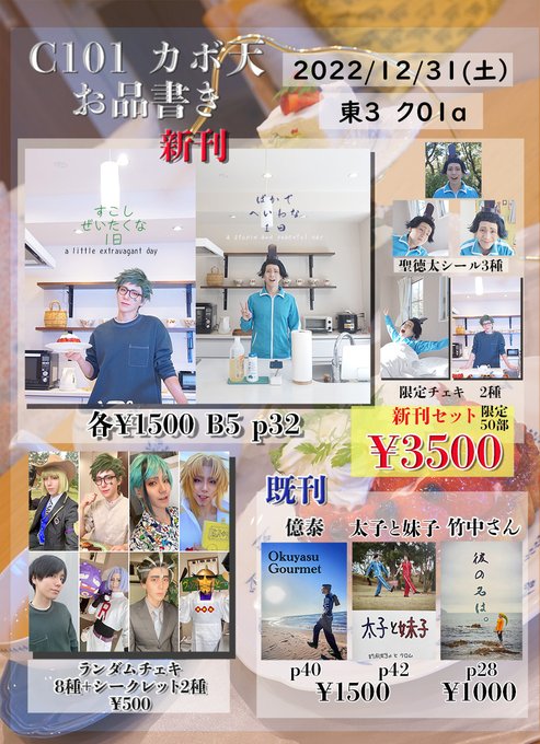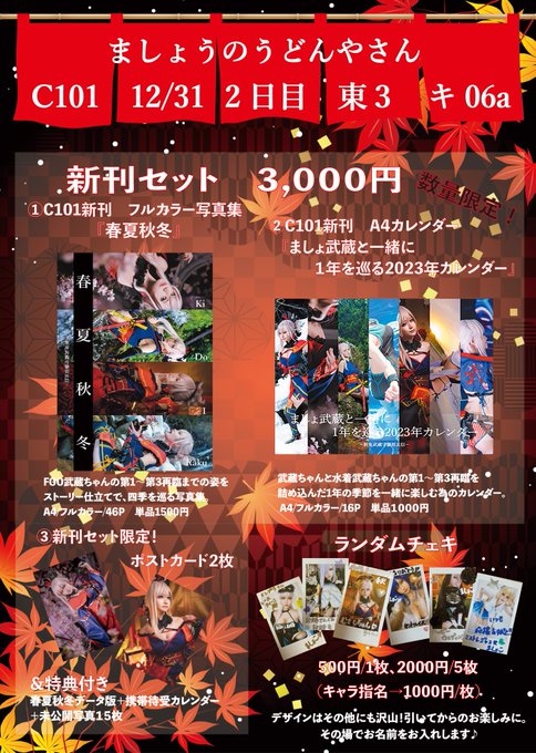 【#C101 冬コミのお品書き】 2日目(12/31) 東3 キ06a 《新刊セット》 ①宮本武蔵写真集 A4 46P ②カレンダー A4 16P ③ポストカード2枚and特典付き 単品、ランダムチェキもあります🎉 通販and取り置き↓↓ masyocos.booth.pm 年内最後のご挨拶させてください〜!🥢 #C101お品書き