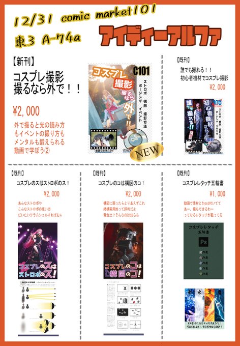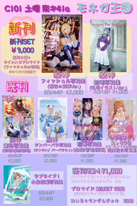 #C101お品書き コミケ2日目に写真集とカレンダーを頒布します\( ˶˙˙˶)/ 会場限定セットやポスターじゃんけん等、いろいろご用意してますので是非お立ち寄りください〜💌💭 さかまたポスターが目印です🎣 土曜日 東ケ31a くろかわカメラ #c101 twitter.com/kurokawa405/st…