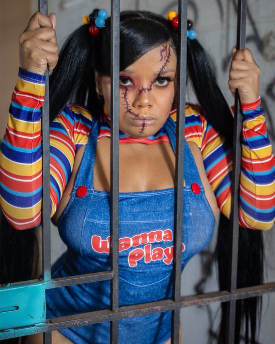 Being locked up is no fun!!!! 😭😭😭 but not for too long 😈😈 Photographer: @TreWattz MUA: @makeupbyvmakup (IG) Hair: @undeniablechels (IG) Chucky costume: @FashionNova #Halloween #novababe #scarytime #chuckyseries #creativity #lockedup #fashionnova #cosplay #costume