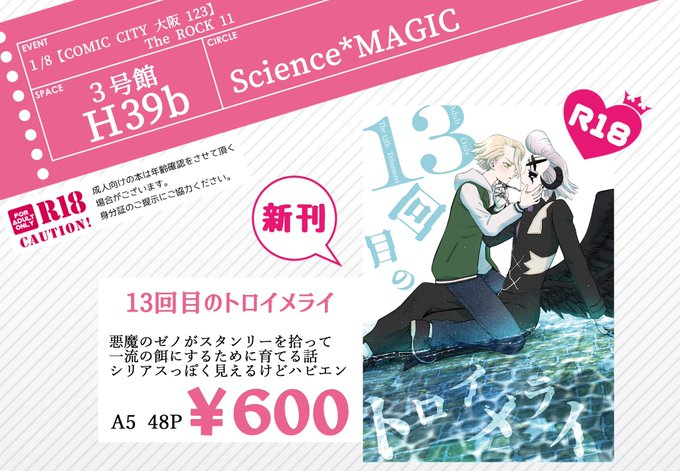 1月8日インテ大阪【3号館H39b】 《Science*MAGIC》頒布物お品書きです🙌 スタゼノ新刊「13回目のトロイメライ」 ◾︎ショタスタ×悪魔ゼノパロ スタゼノ、千ゲンともに既刊も持ち込みますのでよろしくお願いします💪 3.4枚目は主観です🤔ご参考ください🤟 #dcstイベントここに出る_サークル