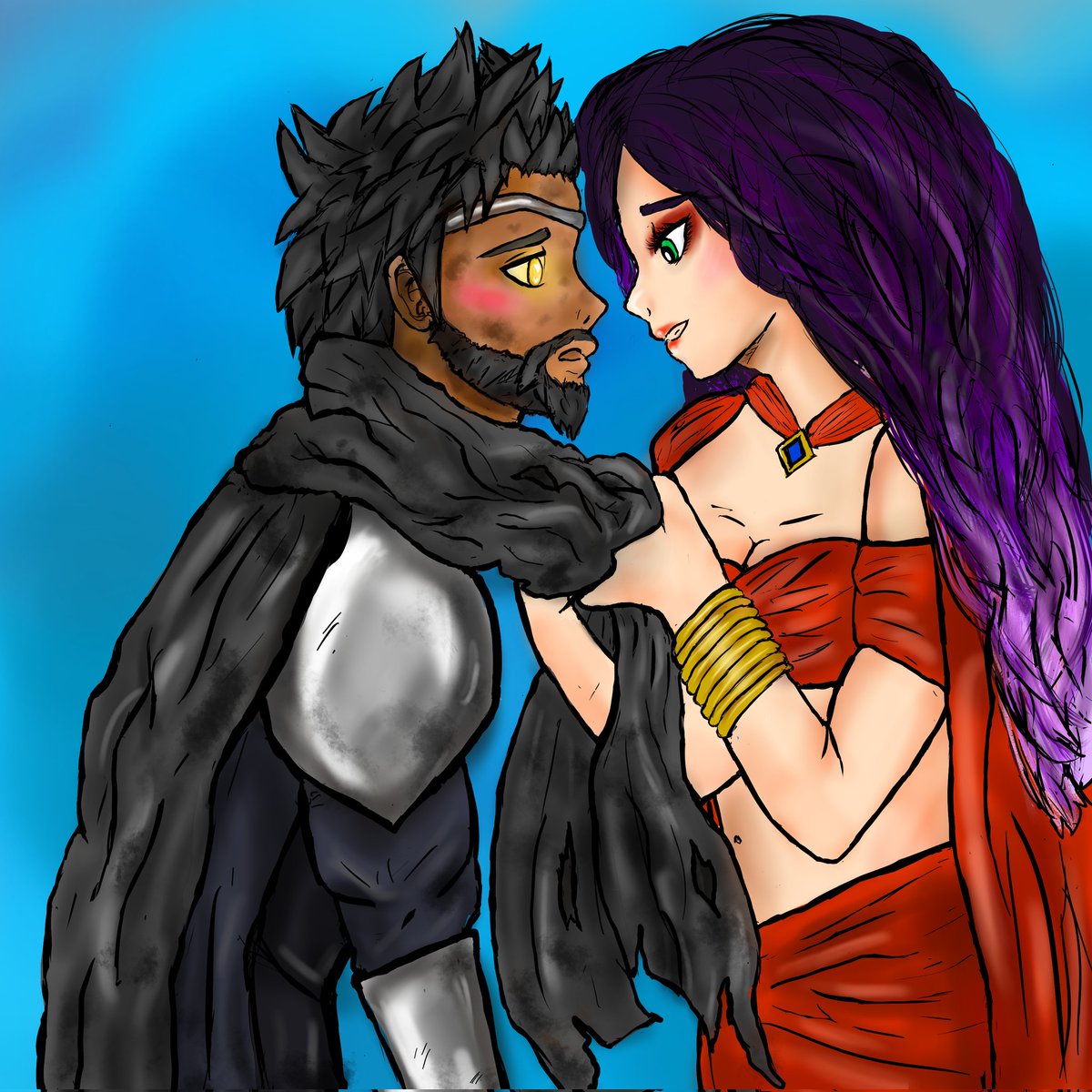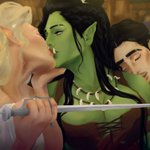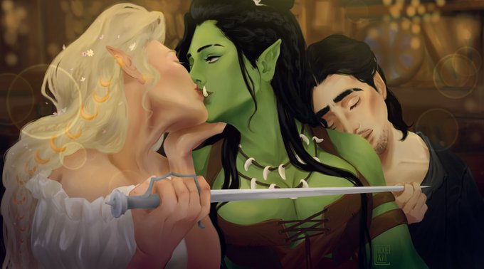 Beauties & the Blade 🗡️ AAH I'm OBSESSED with this new piece by my friend Lucky13! This is my post-campaign headcanon, my Orc Qi'La finally gets to reunite with her GF Dauphine (@nekomiiyax) & brings my BF's PC Sebastian with her 💚 #dndart #DnDcharacter