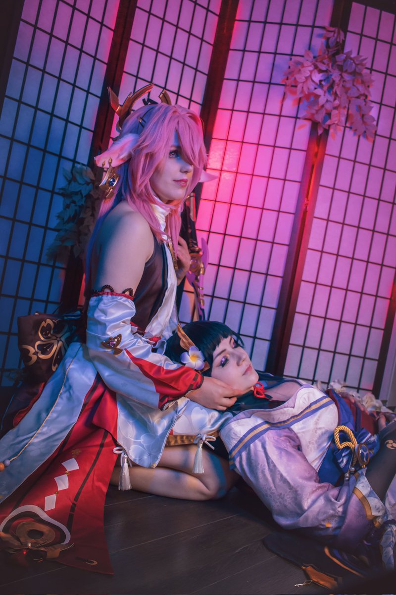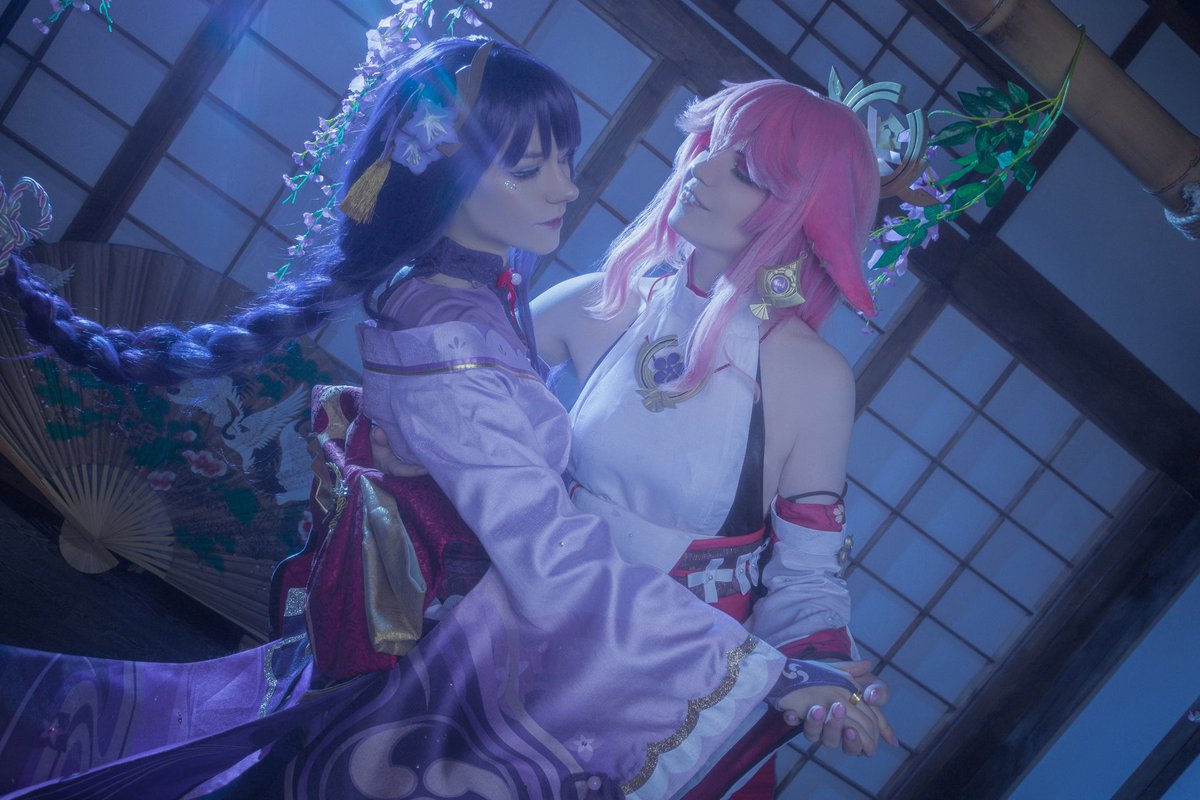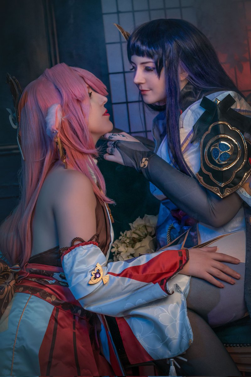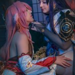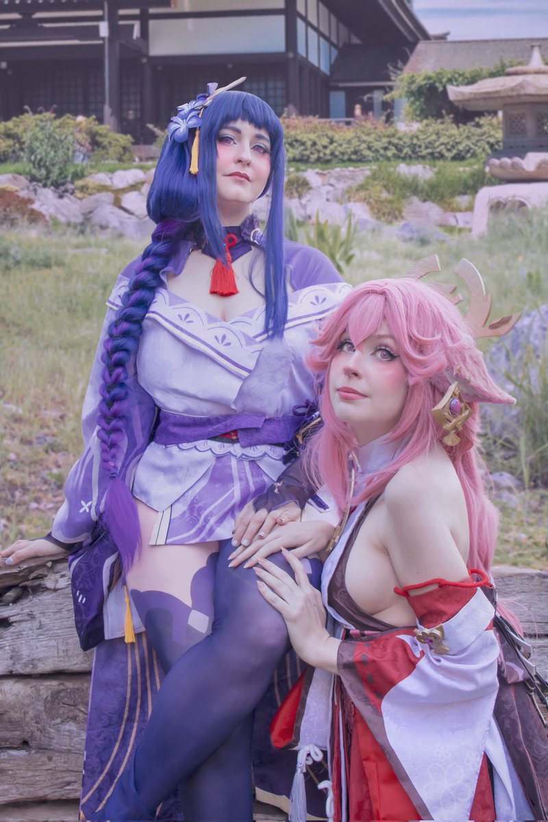 I don't remember if I shared these but how about some very "friendly" Yae Miko and Ei content tonight🤭✨ 💗 @LudmillaNagy as #YaeMiko 💜 MoonBunnyB as #RaidenShogun 📷pics by @niiamin1 #eimiko #genshinimpactcosplay #genshinimpact