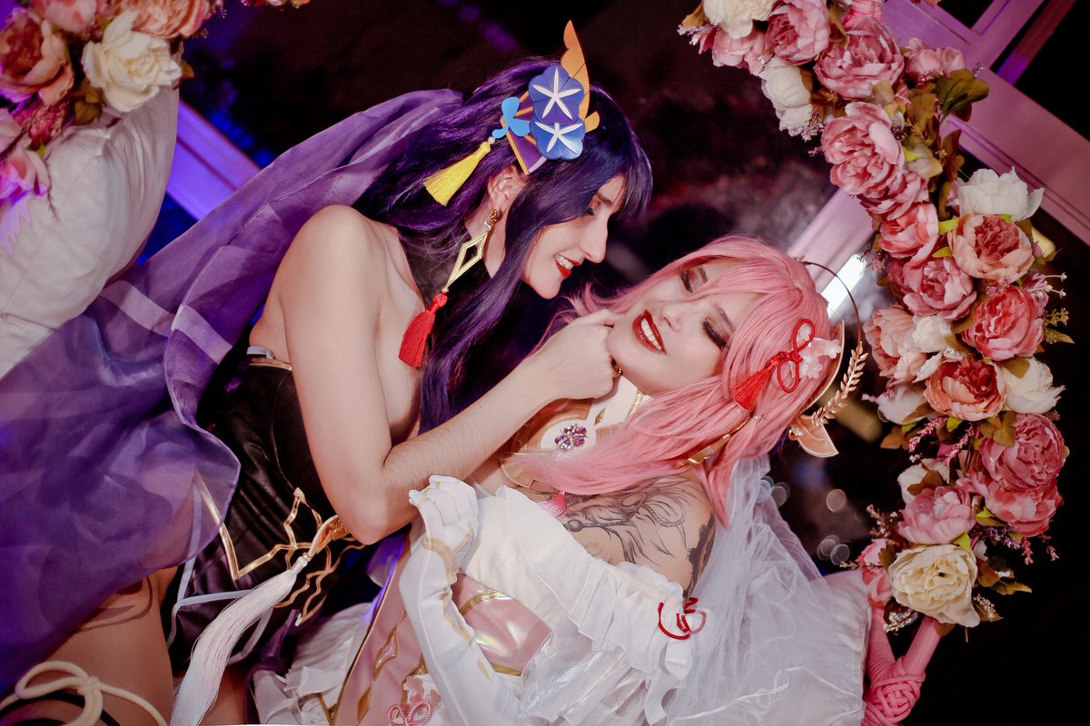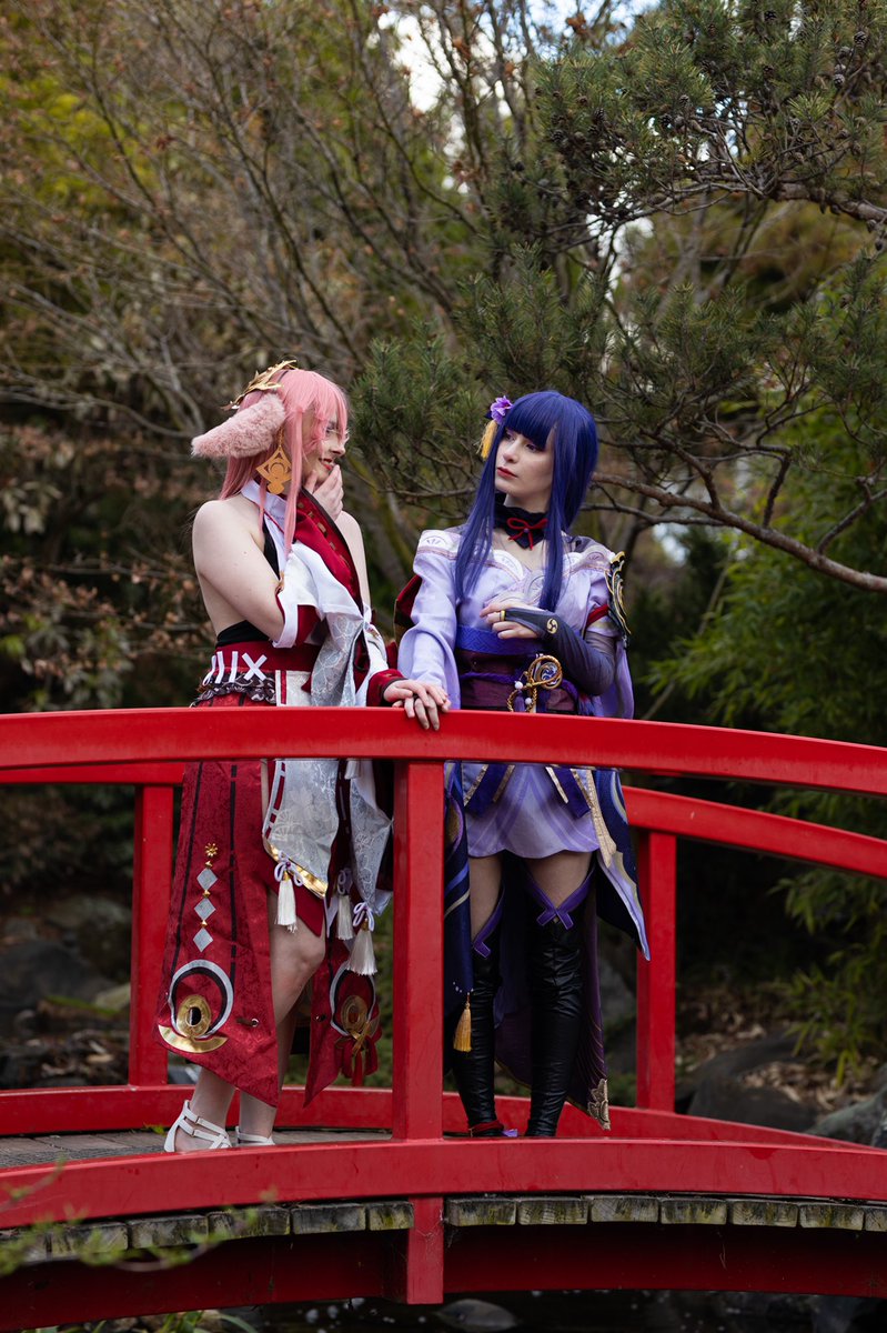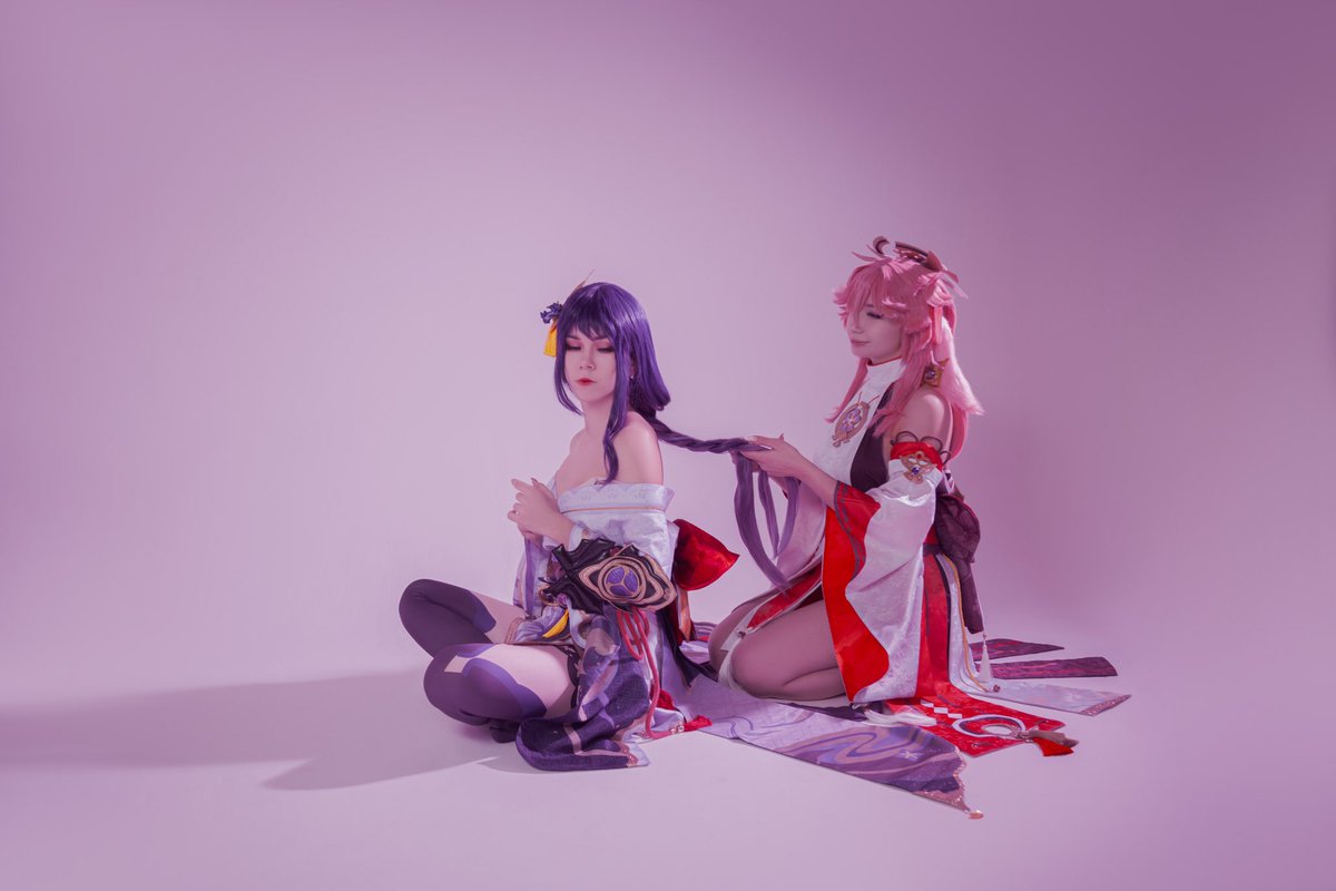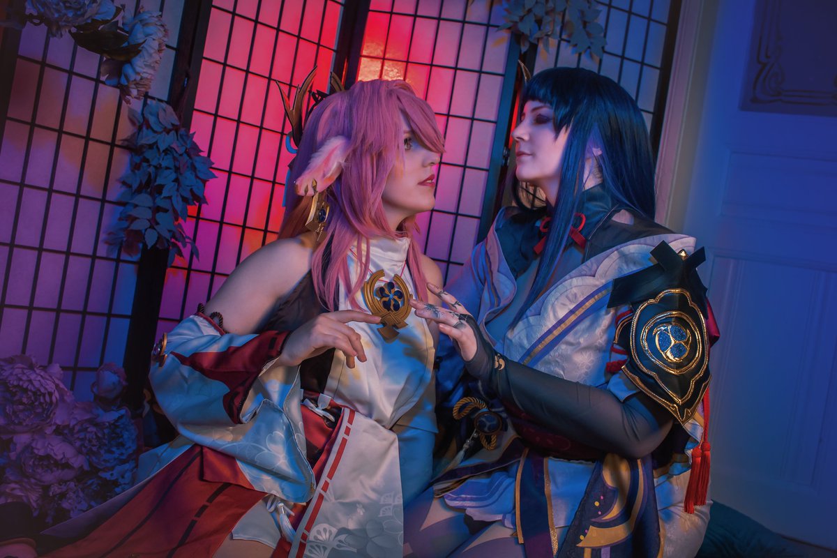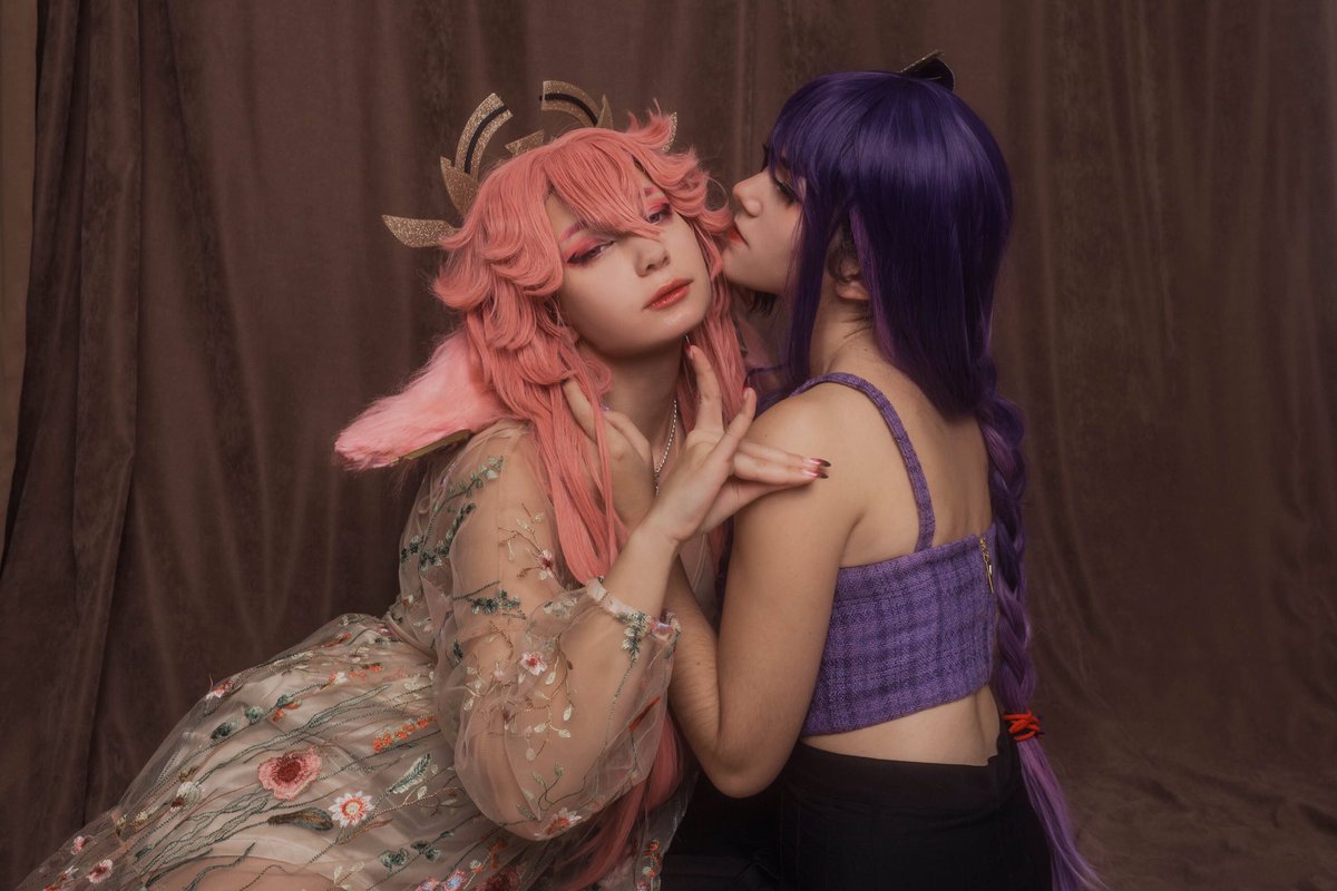 I don't remember if I shared these but how about some very "friendly" Yae Miko and Ei content tonight🤭✨ 💗 @LudmillaNagy as #YaeMiko 💜 MoonBunnyB as #RaidenShogun 📷pics by @niiamin1 #eimiko #genshinimpactcosplay #genshinimpact