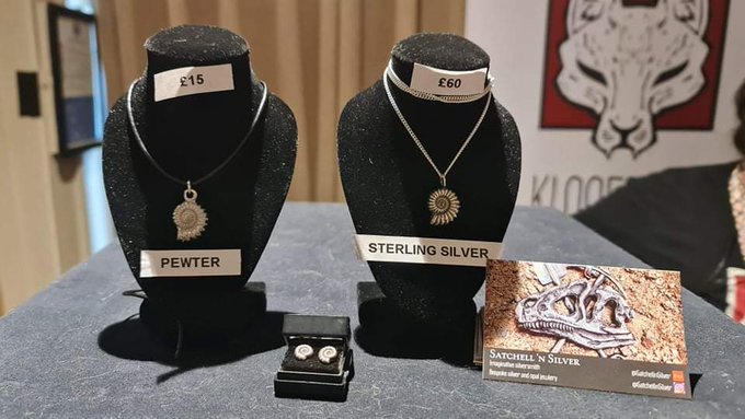 My wonderful partner and owner of @Kloofsuits has kindly taken some of my palaeontology jewellery to display on her stall at a convention in Scotland #fossils #cosplay #jewellery