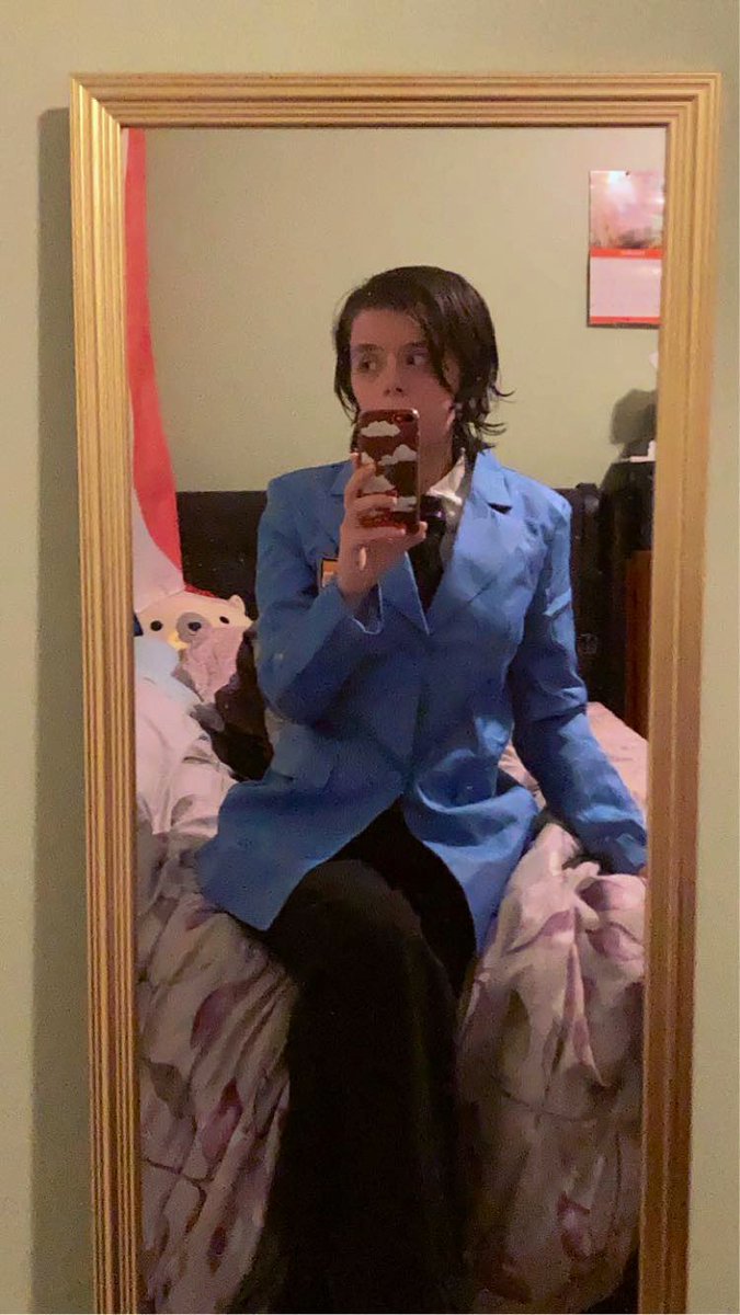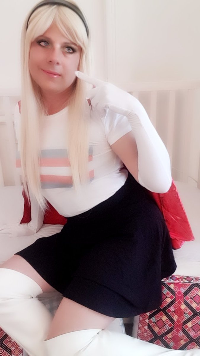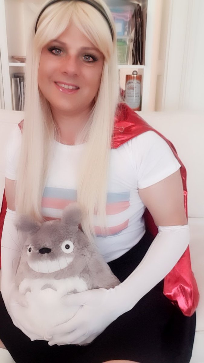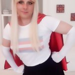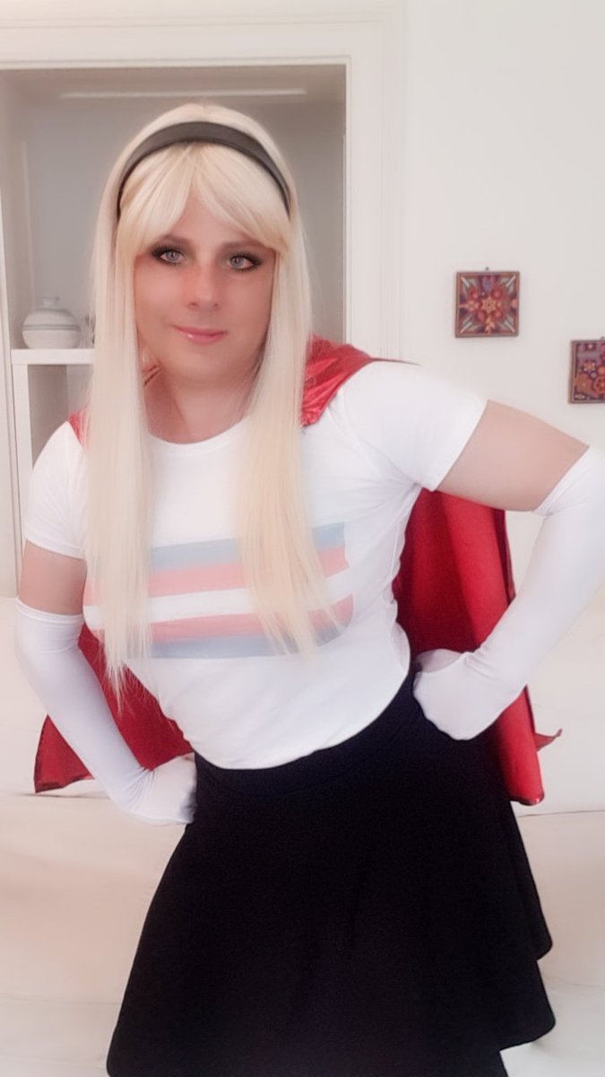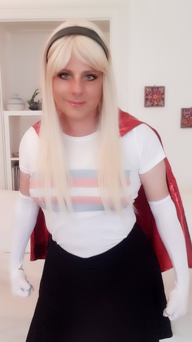 This is a sort-of Supergirl cosplay, that could be both Halloween and Pride costumes🥰 The cape is from a proper Supergirl one, Trans flag top, gloves from a nurse costume, black skirt and Go-Go boots❤ #tgirl #cosplay #cosplayergirl #LGBTQ #genderfluid