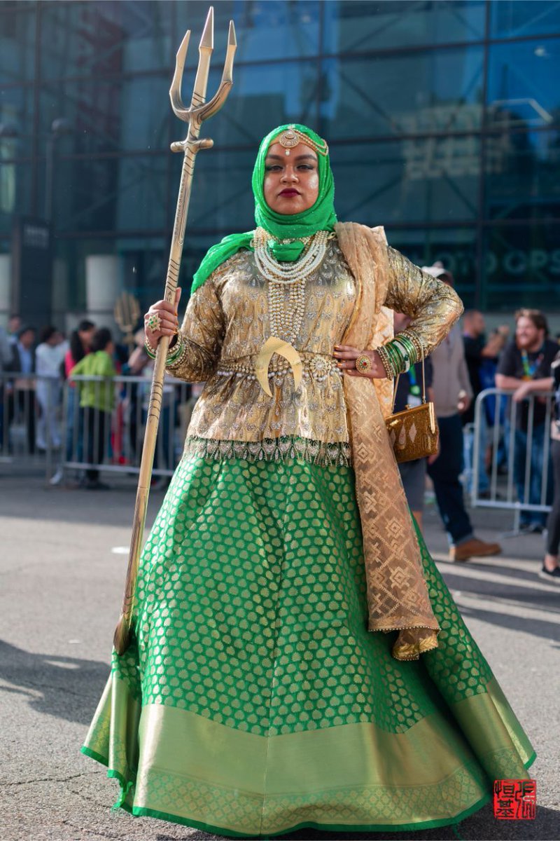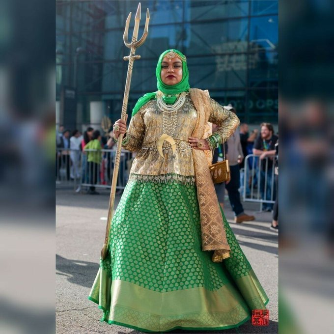 Hijab Aquaman Cosplay by @helalipop Photos by @FoodAndCosplay Taken at @NY_Comic_Con 2019 #aquaman #aquamancosplay #hijab #hijabcosplay #hijabi #hijabicosplay #cosplay #dc #dccomics #dccosplay #bling #trident