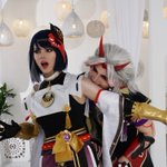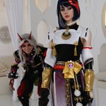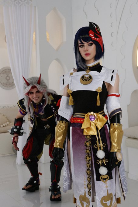 Valentine's genshin impact colab cosplay for my #IttoSara/#SaraItto nation 🖤💛 ~ Mrs Kujou: @SilverCoreC Visions, props and Sara's costume entirely made by her as well! ~ #aratakiitto #kujousara #cosplayer