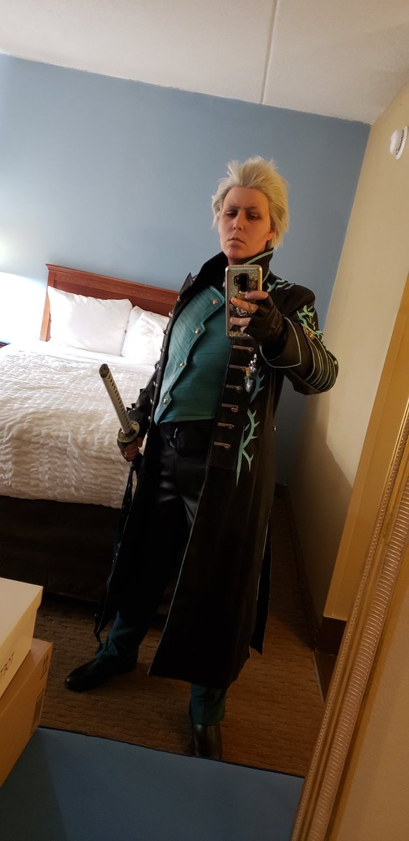 Was briefly in my #Vergil cosplay today for day 1 of #KentokyoCon2021 before switching into his Capcom Cafe outfit for the late night formal. It's so comfy I s2g #cosplay #DevilMayCry #DevilMayCry5 #dmc #dmc5 #KentokyoCon