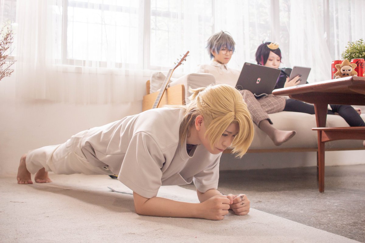 random morning plank(?) along🍬🫗💦 Shu / me Ike / 雪 @snowmoon1018 Luca / 泉 @izumi0016 Photo / Gatzu #cospleyy #yaminoArt #Lucubs #Ikenography #nijisanjiencosplay