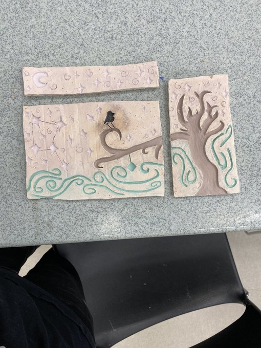 underglaze of my #philzafanart ceramics project thing - crow : chat - emerald/green wisps : technoblade - constelation : corvus (crow) - heart : kristin :D