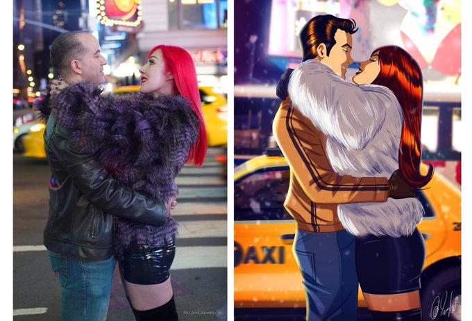 Happy #Anniversary to us! 🍾 And thanks to @DespopArt for the amazing #PeterParker and #MaryJane piece you made for us! ❤️ #MJandSpidey #MaryJaneWatson #SpiderMan #DesTaylor #PopArt #NYC #TimesSquare #SpiderVerse #Marvel #Comics #Cosplay #Retrowave #Model #Photography #ComicCon