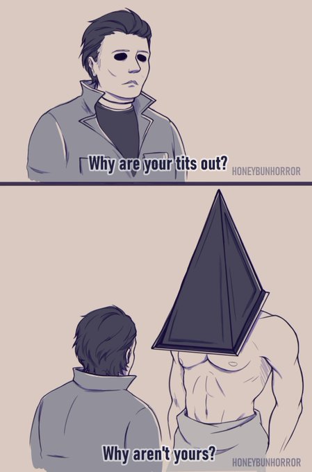 Michael questions Pyramid Head's fashion choices (like he's one to talk 🙄). ° ° ° [#MichaelMyers #pyramidhead #dbdfanart #DeadbyDaylight #slashershenanigans #dbd ]