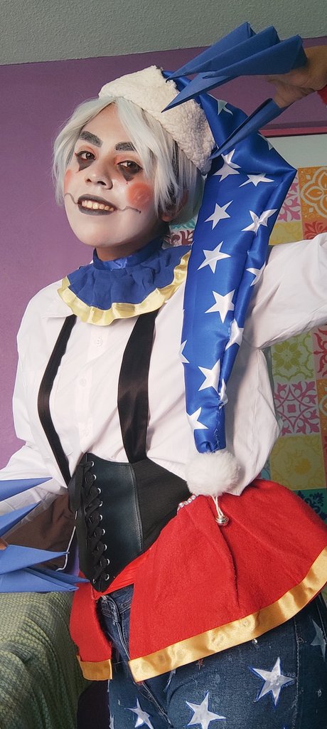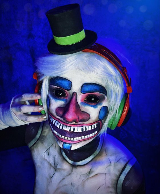 Starting up my first Twitter! First Post: The finished product and the process of my DJ Music Man makeup! I handcrafted the hat and painted the headphones. The entire piece took so many hours! 😭🖤 #ArtistOnTwitter #FNAF #securitybreach #cosplay #makeupartist #DJMusicman