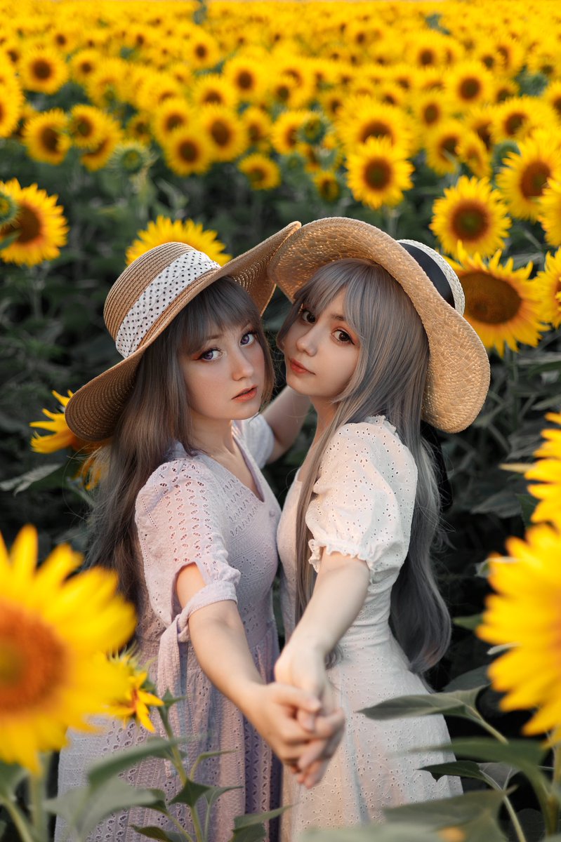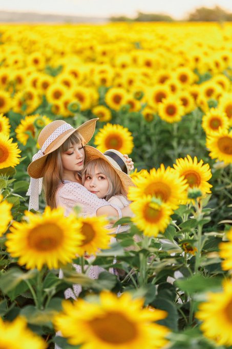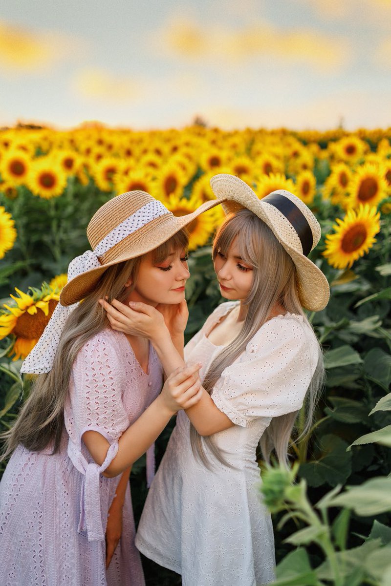 🌻 ~ md: @mashiro__m_ ph: @Reifox_x More photos in my Gumroad link in my bio #sisters #sunset #sunflower #sunflowers🌻 #cosplay #sisterslove❤️ #cute #подсолнухи #photography #photoshoot