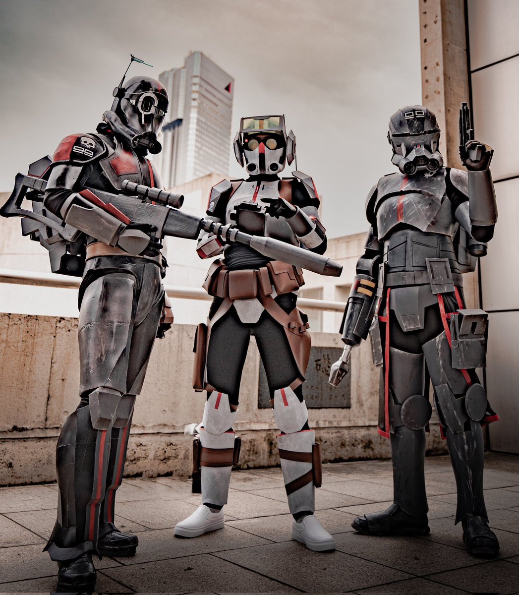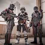 [Name's Hunter] Finally posting our Bad Batch Cadet trio and look at US!! @Fate_Evance living her best life as Crosshair of course 😎 Thank you @elbalcreates for the pic 🧡 #TheBadBatch #StarWarsCosplay #CloneForce99